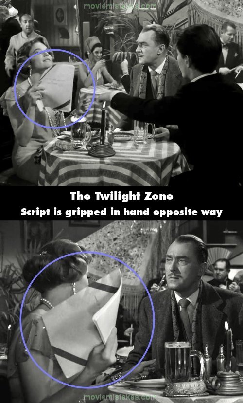 Continuity mistake: At Freddie's speakeasy, when Laura lifts Barney's script from the table, she begins to fan herself. In the wide shot, the script's titled top page with corner diagonal stripes is gripped under Laura's four fingers, with the blank back page at her thumb. It cuts to a close-up, and now the script is gripped in Laura's hand the opposite way, with the top page at her thumb (the back page is blank).
