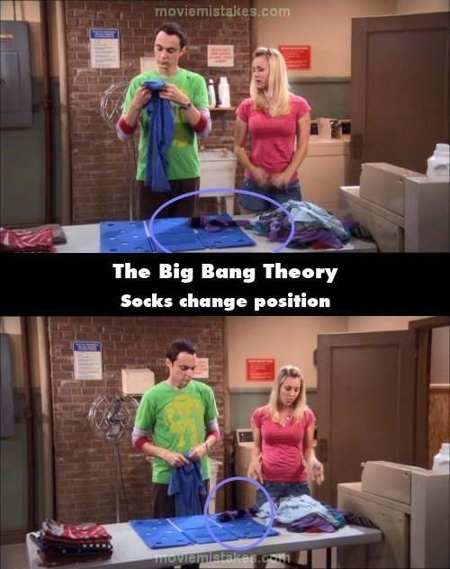 Continuity mistake: Penny throws Sheldon's sock down on the table, and their positions change when Sheldon picks them up, despite no one touching them. (00:05:50)