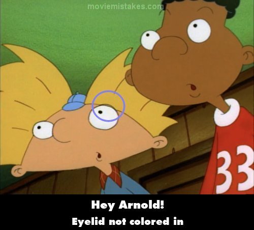 Other mistake: Oskar Gets a Job: In the beginning of the episode, Arnold and Gerald overhear Oskar arguing with a man in his room. In the close-up of Arnold and Gerald as Oskar says, "You're a big man, aren't you?", Arnold's right eyelid is not colored in. (00:12:17)