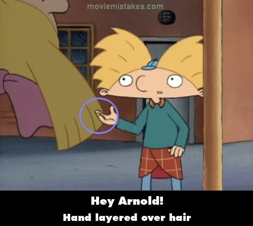 Revealing mistake: Monkeyman!: When Arnold tells the kids that Monkeyman saved him, as he says, "He went after the two guys who were trying to mug me," he moves his right hand, and it's layered over Helga's hair. (00:01:25)