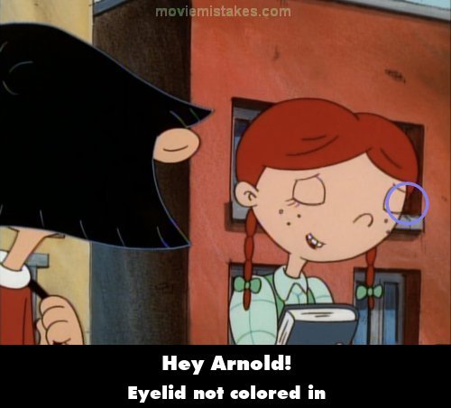 Other mistake: Arnold and Lila: When Rhonda, Lila and Nadine are talking about what Helga wrote on the wall, as Lila says, "It couldn't possibly be true, could it?", she blinks, and her right eyelid is not coloured in. (00:03:12)