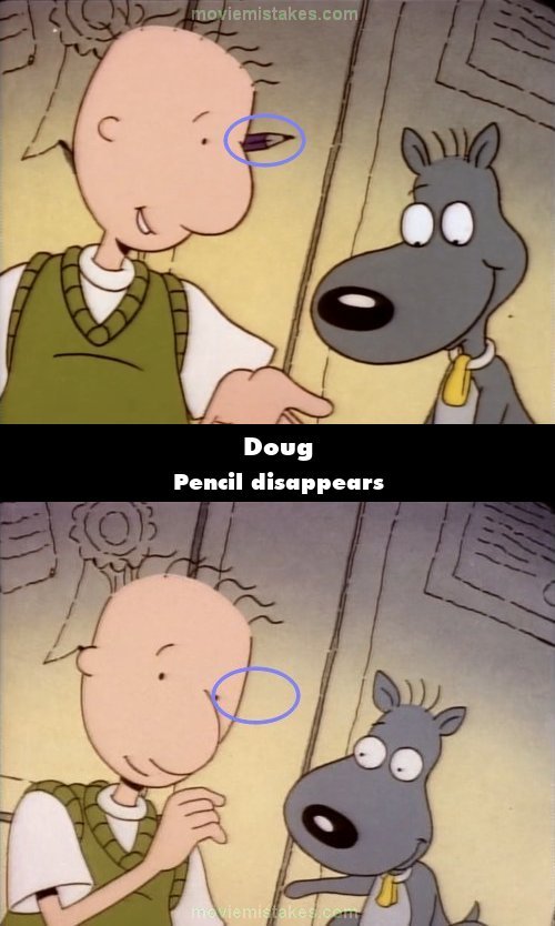 Continuity mistake: Doug is Quailman: When Doug tells Porkchop to sign his name on the comic book, his pencil is tucked in his ear. When Porkchop prints the page and they both shake hands, the pencil is gone. (00:02:00)