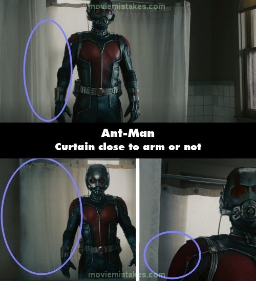 Continuity mistake: When Ant-Man steps into the tub, he is next to a curtain. Shot swaps to a wide angle and the curtain is gone, only to reappear next to him a shot later.