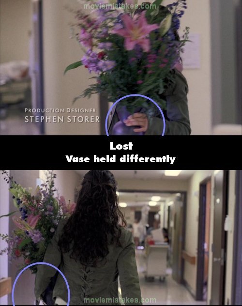 Continuity mistake: At the hospital, the way Kate holds the vase of flowers differs between shots. In the front shot, she is holding it by the neck of the vase, and in the rear shot, she is holding it by the bottom. (00:06:50)