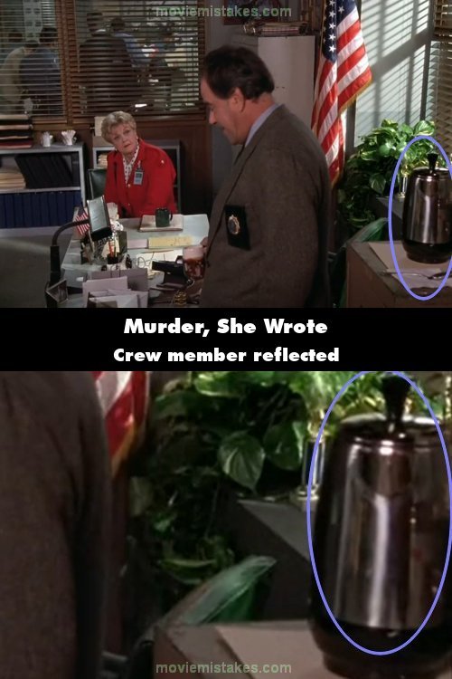 Visible crew/equipment: When the cop grabs the coffee pot, a filming crew member with blue trousers is reflected on it.