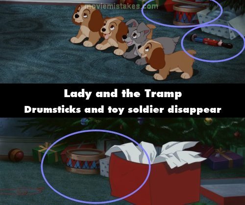 Continuity mistake: When the puppies are playing with Jock, the drumsticks and toy soldier disappear and reappear randomly between shots.