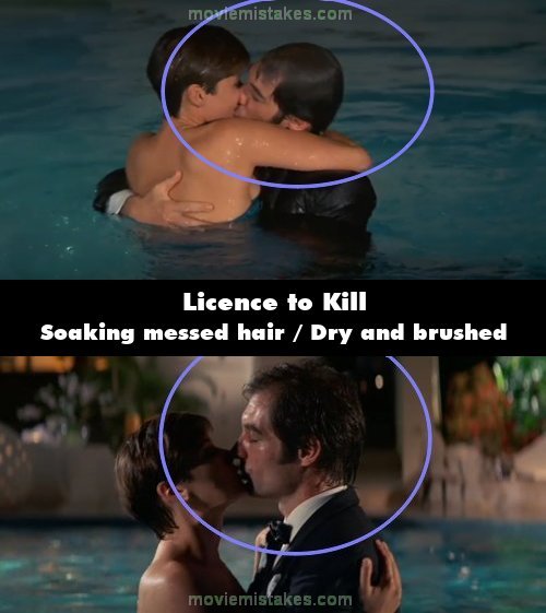 Continuity mistake: Bond falls in the pool and hugs Pam, his messed-up hair soaking wet. Three seconds later, it's drier and nicely brushed.