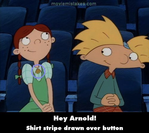 Other mistake: Dinner for Four: When Arnold and Lila are talking to each other in the beginning, Lila says that she hopes to become a famous ballerina one day if she practices hard enough. In this shot, a stripe on her shirt is mistakenly drawn over her gold button. (00:01:26)