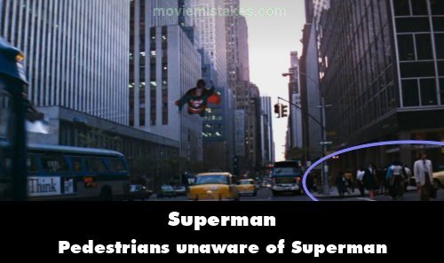 Revealing mistake: When Superman hears Lex's message, he flies all over Metropolis very close to the street, but no one reacts, revealing it was a superimposed projection and the extras were not told how to act. (01:41:45)