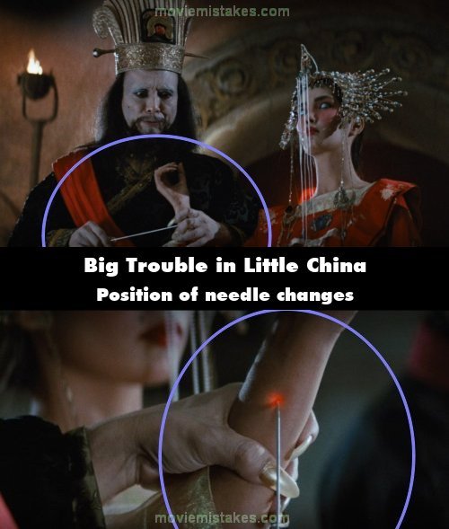 Continuity mistake: When Lo Pan stabs the needle, the way he grabs the arm and the position of the needle change between instant cuts.