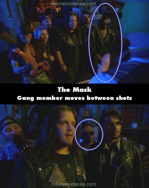 Continuity mistake: When The Mask is making balloon animals, one gang member switches position between shots, shifting to the side of the gang leader to behind him. (00:21:26)