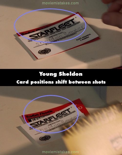 Continuity mistake: Sheldon places his membership cards down on a flat surface. He puts Radio Shack first, followed by Star Command, almost entirely covering it, leaving just a small section of red along the top. When the shot changes to a wide-angle one, the Star Command card has moved down and more red is visible above it. (00:01:00)