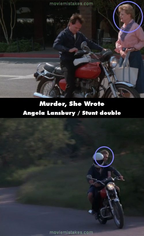 Revealing mistake: When Jessica rides on the motorcycle, one can see it's a much younger and thinner stunt double who doesn't resemble Angela Lansbury.