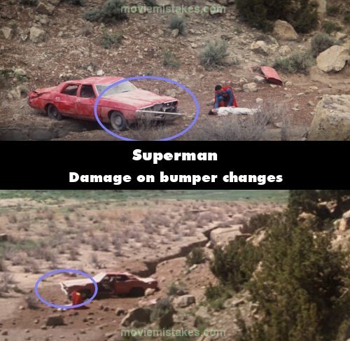 Continuity mistake: When Superman saves Lois from the car crash, the bumper's damage changes between shots: sometimes it's dangling on the edge, others it's attached to the car.