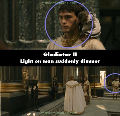 Continuity mistake: When Acacius arrives in Rome and meets with the Emperors, there is a man with a monkey on his shoulder, his face surrounded by bright light. An instant cut later, his face is in the shadows.