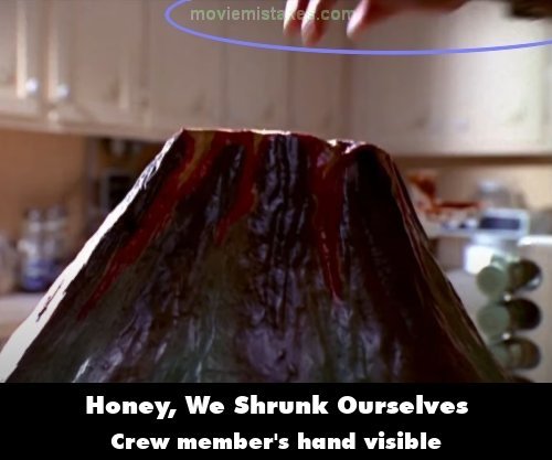 Visible crew/equipment: When the kids are making their volcano, for a split second, a crew member's hand is visible placing the balloon in place. (00:34:07)