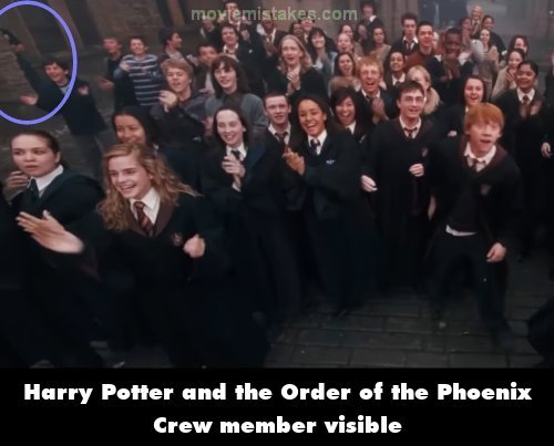 Visible crew/equipment: When all the students run after the Wesley twins on their brooms while they make explode fireworks in the air just after having savagely interrupted the O.W.L. exams, a crew member dressed as a cop can be seen standing straight on the left side of the screen, badly hiding behind a column while the shot shows all the students watching in the sky. I suppose he was a guard or crew supervisor who would have given instructions to the extras about when they must have been in the shot. (01:37:27)