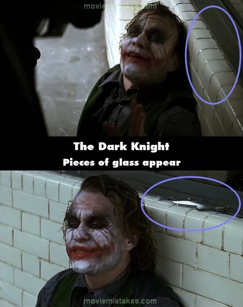 Continuity mistake: When Batman slams Joker's head against the glass after he says he took Rachel too, there are no pieces of glass on the wall shelf, but later a big piece of it alongside some more little ones is visible when Joker asks for his phone call. (01:30:00 - 01:33:05)