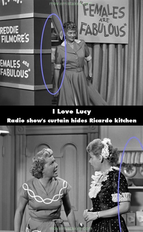 Revealing mistake: At Freddie Filmore's radio show, when Lucy steps out from behind the curtain, a bit of the kitchen from the Ricardo apartment is visible behind Lucy; it's the cabinet area with plates and canisters, beside the refrigerator. (00:06:15 - 00:19:40)