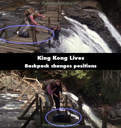 Continuity mistake: After Mitch saves Amy from falling into the river, the backpack changes position between shots.