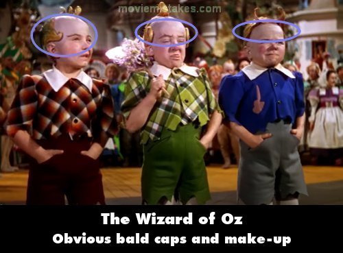 Revealing mistake: The Lollipop Guild's bald caps and face makeup to hide them, especially the ones on the sides, are very, very obvious.