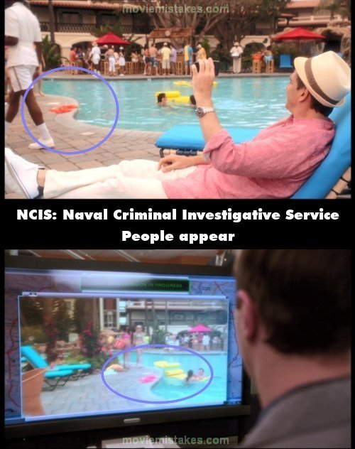 Continuity mistake: When Tony is on a video call with Ziva and McGee, in the shot of Tony holding out the phone, there is no-one in the pool by the orange towel. When we see the same shot from the video call in NCIS, two people have appeared by the orange towel with no time to move into position. (00:16:30)