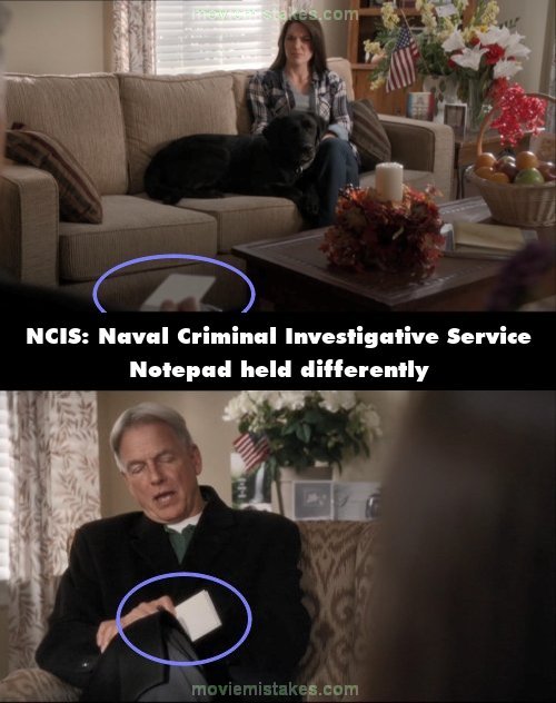 Continuity mistake: When Gibbs is asking Ruby about any issues at home, the way he holds his notepad keeps changing between instant cuts. (00:11:22)