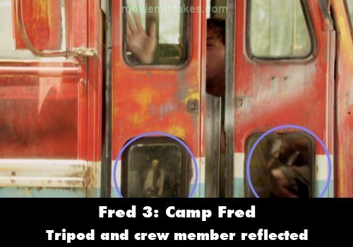 Visible crew/equipment: When Fred is carried on to the Camp Iwannapeepee bus and the doors close, a camera tripod and crew member are reflected in the door windows. (00:08:57)