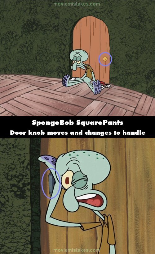 Continuity mistake: After Squidward finishes giving away all his stuff, in the close-up of him as he says, "Am I insane?", not only is the yellow door knob on the left side instead of the right like in the last shot, but it also turns into a gray door handle. A shot later, it's back to a yellow door knob on the right side. (00:20:05)