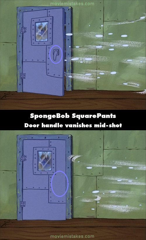 Other mistake: SB-129: When Squidward goes inside the freezer and shuts the door, the freezer's door handle vanishes mid-shot. (00:03:09)