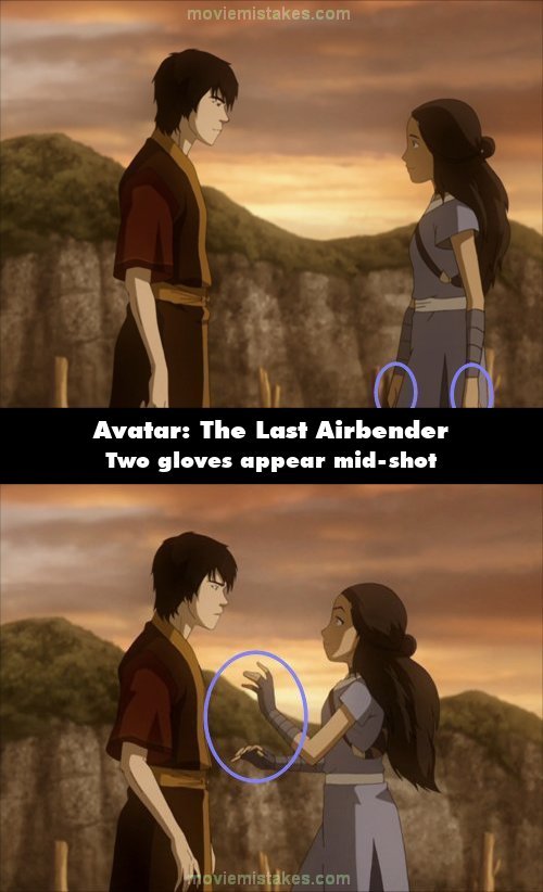 Continuity mistake: When Katara goes to hug Zuko at the end, she is not wearing gloves on either of her hands, but then a glove appears on her left hand mid-shot, and her right hand also has one once she puts her arms around Zuko. (00:23:04)