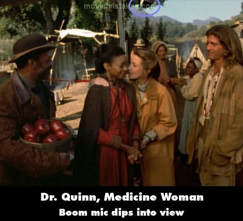 Visible crew/equipment: After Robert E cuts the red ribbon to the new Freedmen school, when Michaela puts her arm around Grace and says, "You'll do fine, Grace," the boom mic dips into view at the top of the screen. (00:12:10)