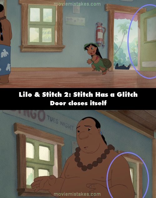 Continuity mistake: When Lilo enters the hula class near the start, she leaves the door open, but a few seconds later, the door is suddenly closed. (00:05:33)