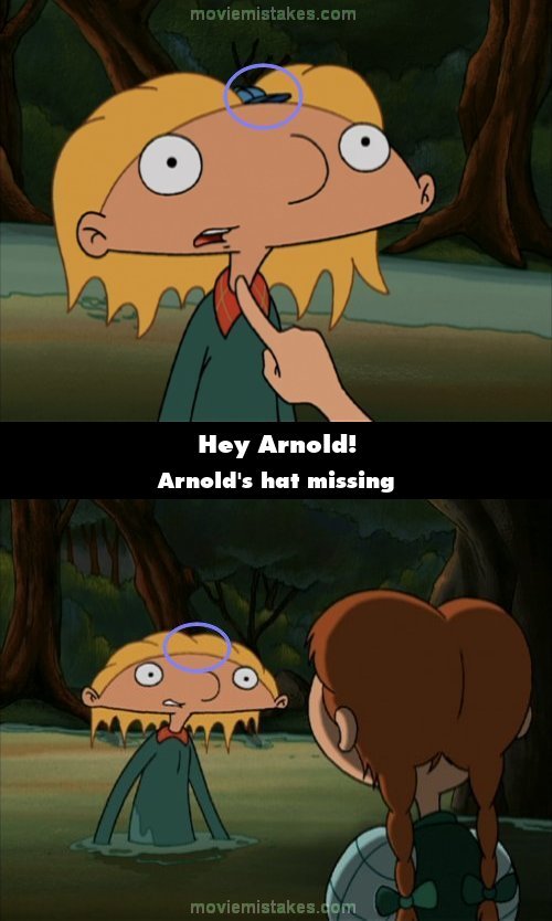 Continuity mistake: Arnold Visits Arnie: When Arnold and Lulu are in the swimming hole, Lulu tells Arnold to meet her later for a private swim. Then, when Arnold tells her, "But you're Arnie's girlfriend," his hat is missing. (00:05:14)