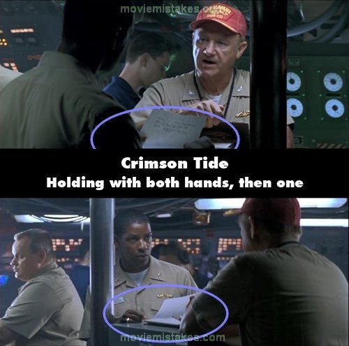Continuity mistake: When discussing the broken EAM, Hunter is holding the message with two hands or one hand depending on the angle. (00:53:50)