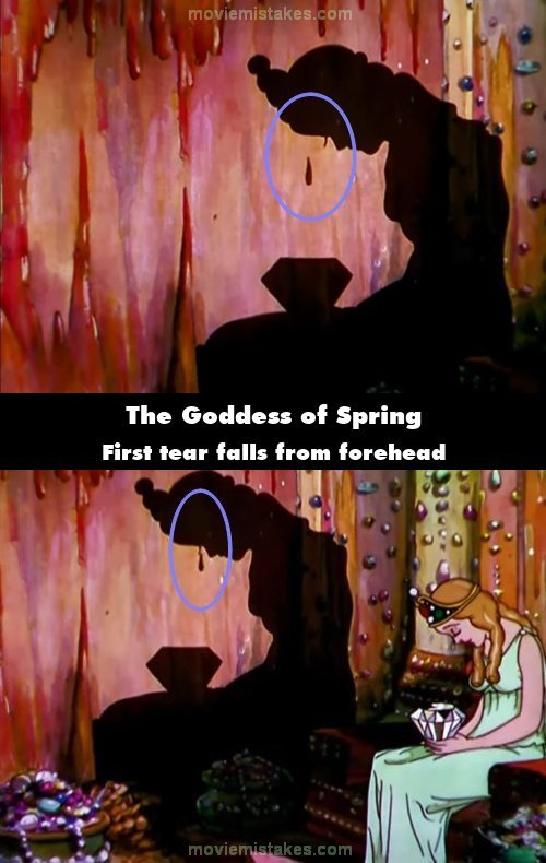 Other mistake: When Pluto/the Devil gives a big diamond to the Goddess of Spring down in hell, it shows them by silhouette shadows on the wall. Her head is hanging and bowed towards her lap. It shows her cry a tear onto the diamond by shadow, but the placement of the shadow shows the drop come from her forehead, not her eyes. Whereas a moment later, without her moving, the camera pulls back and shows her cry more tears, this time from her eyes, and the shadow shows the tear come from the correct location. (00:06:20)
