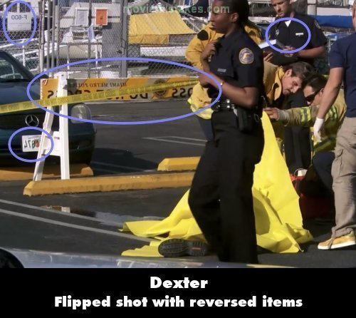 Revealing mistake: After the intro at the start, it cuts to Dexter passing the fire engine, and the next long shot with a firefighter lifting the yellow tarp is a flipped shot; note the backwards licence plate, sign, etc.