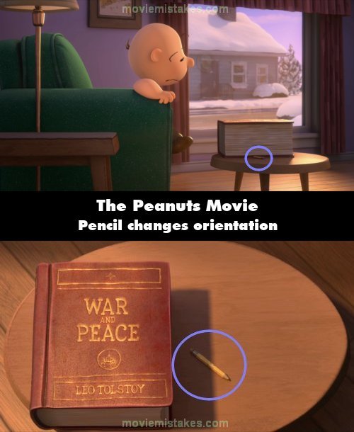 Continuity mistake: When Charlie Brown sleds home from the library, the book flies into him and throws him into the chair. The table that the book lands on has a pencil on it, but in the next shot, it is facing the opposite way. (00:48:58)