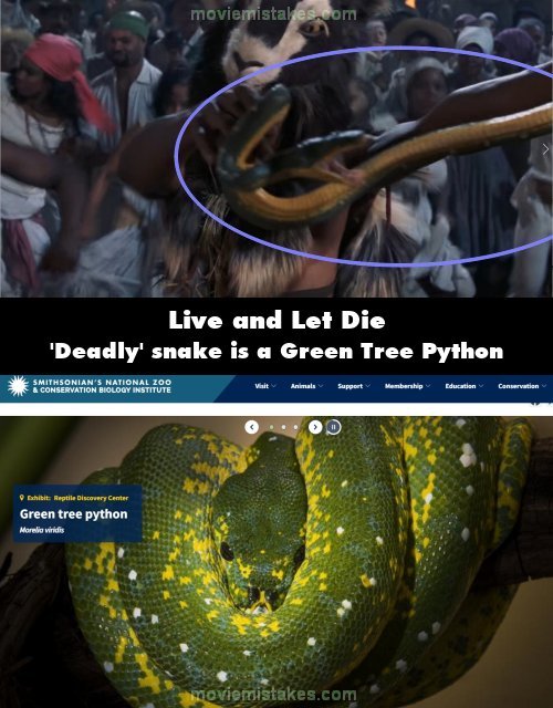 Factual error: At the opening voodoo ritual, a large green snake is used to kill a man. The species is visually identifiable as a Green Tree Python, a non-venomous constrictor from New Guinea and northern Australia. It would never be found in the Caribbean, where the film is set, and despite being shown as lethal with a bite, in reality, it can't deliver venom. At worst, it could constrict small prey, not instantly kill a human. (00:04:15 - 00:04:55)