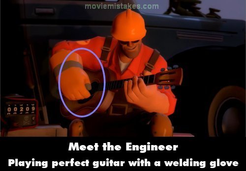 Deliberate mistake: The engineer is playing guitar perfectly while wearing a thick welding glove on his right hand. In reality, welding gloves are designed for heavy protection, not dexterity. They're bulky, stiff, and remove nearly all tactile feedback, making precise plucking or strumming impossible. Even holding a pick would be extremely difficult, so his flawless guitar playing is only possible through cartoon exaggeration. (00:00:05)