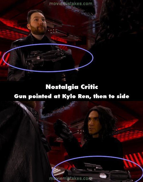 Continuity mistake: When Hux is holding Kylo Ren at gunpoint, and then Kylo force-chokes him, Hux's gun keeps changing positions between each shot. Sometimes pointed directly at Kylo, then pointed off to the side, then his arm down. (00:16:50)