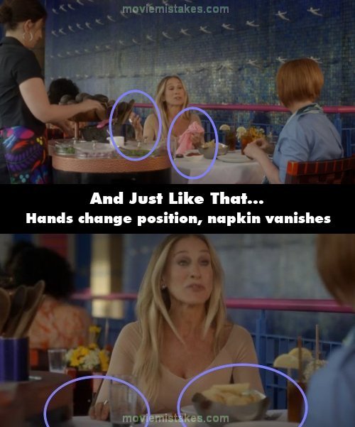 Continuity mistake: When Carrie is about to walk away from Miranda and the waitress, she's holding a pink napkin in her left hand with her right arm extended. In the next shot, the napkin has vanished and her right arm is lowered.