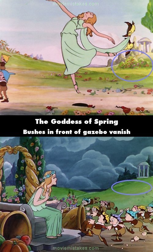 Continuity mistake: As Persephone is dancing along the path to get to her throne, in the background there is a gazebo sitting on a hill with trees behind it and bushes in front of it. Later, when Pluto is rising up from Hell, we get another shot of the gazebo and the trees behind it have changed, as well as the bushes in front of it that have vanished. (00:01:05 - 00:02:15)