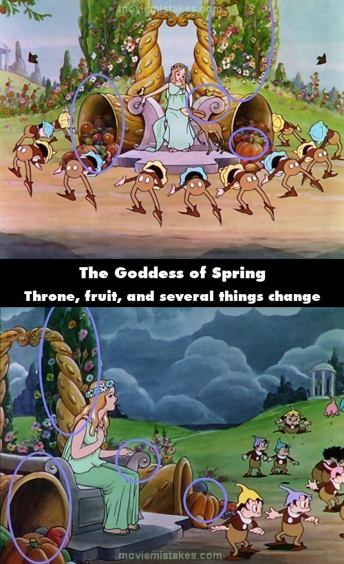 Continuity mistake: After Pluto arises from Hell, we get a side shot of Persephone's throne. In this angle, several things about her throne and the items around it have changed. The throne itself is wider, the curls of the arm rests are smaller, the cornucopias have shrunk and have less food in them, some of the fruit in front of the cornucopias has changed or disappeared, the stems on the pumpkins change, and one of the trees behind her throne is now much closer and beside her. (00:02:17)