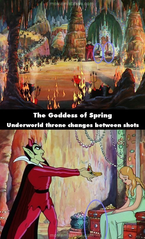 Continuity mistake: When Pluto is presenting Persephone with a crown, the throne she is sitting on changes its design in the close-up than what it was in the far shot before he set her down. Most notable is the space under the armrests was open in the distance, but in the close-up is filled in. (00:04:02)