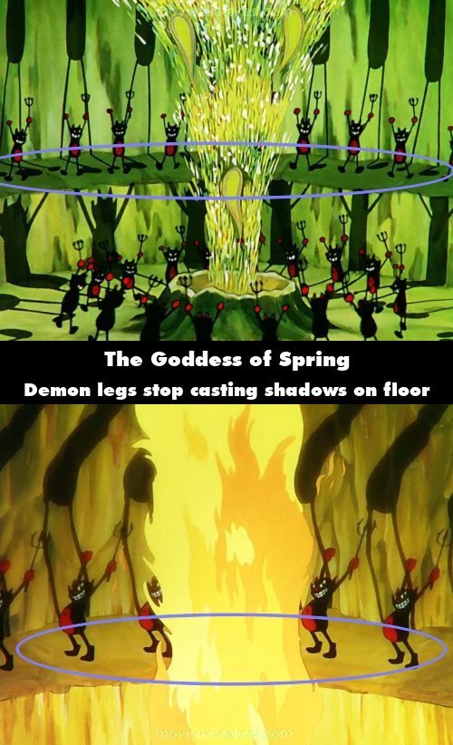 Continuity mistake: The demons are dancing and singing around a roaring fire down in Hell, and they are casting shadows from the light of the fire. When the shot dissolves to a close-up of the demons on the upper level, their legs are no longer casting shadows on the floor, just shadows on the wall. (00:04:47)