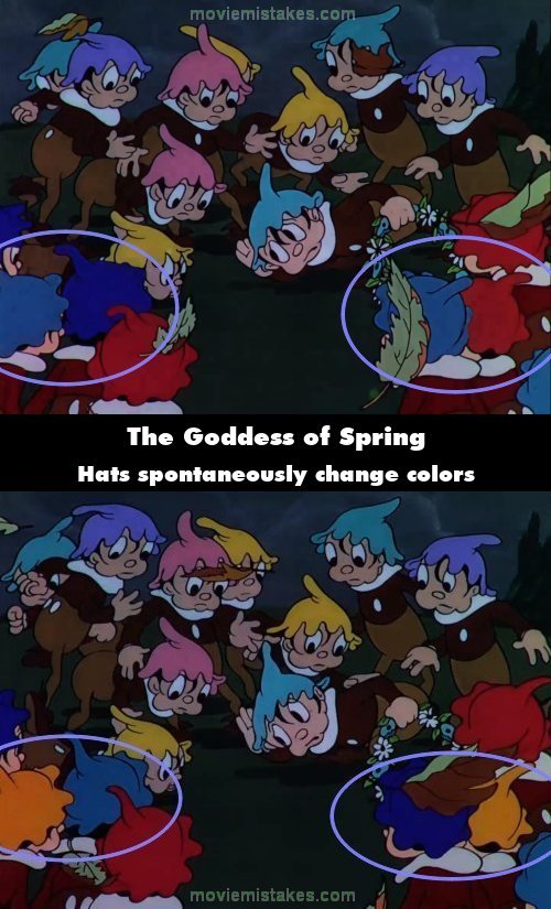 Revealing mistake: After Persephone is taken down to Hell, the elves gather around her wreath trying to figure it out. As the shot is slowly fading to black, suddenly some of the elves spontaneously change hat colours. On the left side, the light blue hat changes to orange and the dark blue changes to light blue. And on the right side, another light blue suddenly changes to dark blue, and a red hat changes to orange. All in a single frame. (00:03:34)