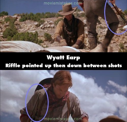 Continuity mistake: After the wagon chase shoot-out where Wyatt tells Dutch to shoot the lead horse, Wyatt is standing on top of the wagon holding his rifle. In one shot, the barrel is up in the air; then in a quick shot of his legs before he jumps down, the gun is pointed down. Then in the next shot, as he's jumping down in a close-up, it's pointed up in the air again. (00:18:56)