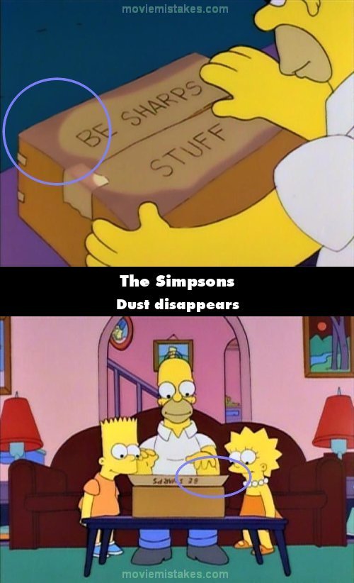 Continuity mistake: When Homer wipes the dust off the box, there is still some visible dust on the box. When the shot changes, this dust has disappeared. (00:16:40)