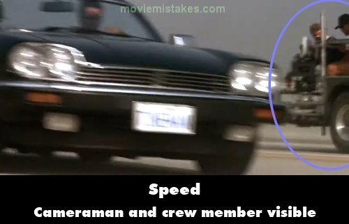 Visible crew/equipment: When Jack runs with the car after the bus just before yelling to the driver that there's a bomb aboard, when he does a risky maneuver, a cameraman and another crew member sitting on a tracking vehicle are briefly visible on the right side of the screen. (00:36:20)